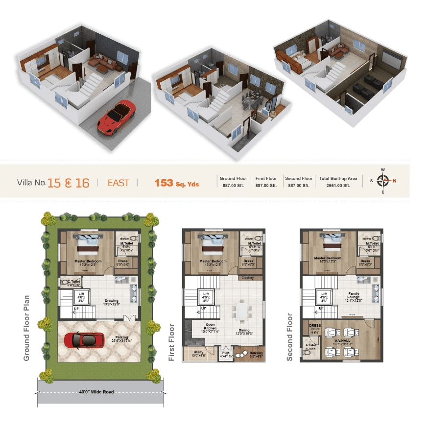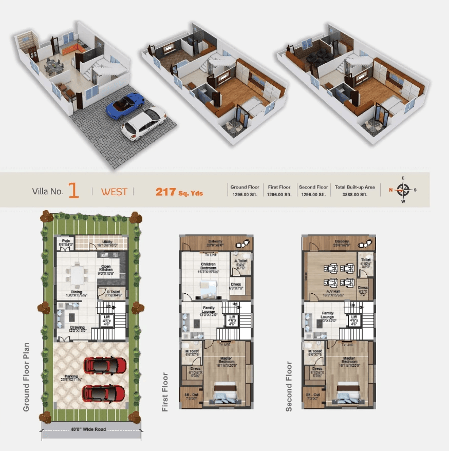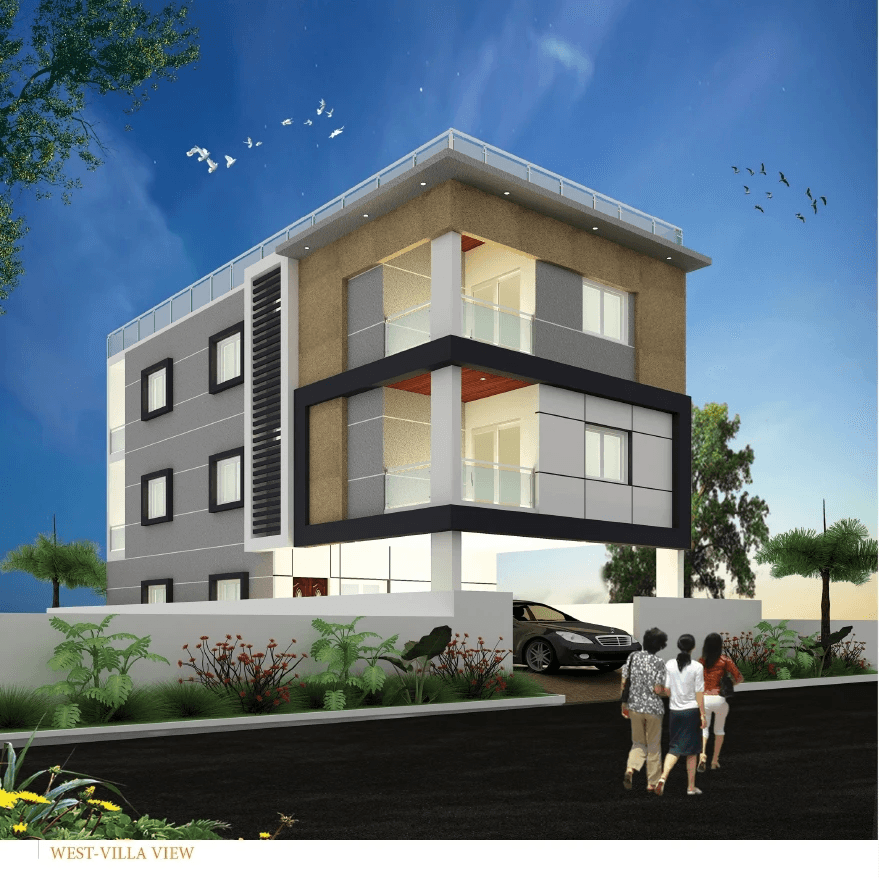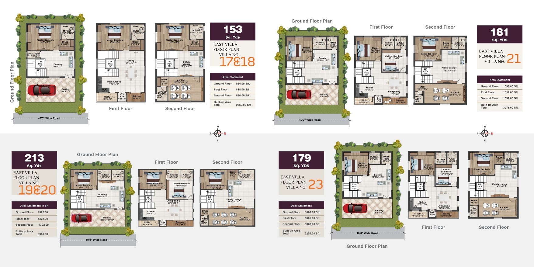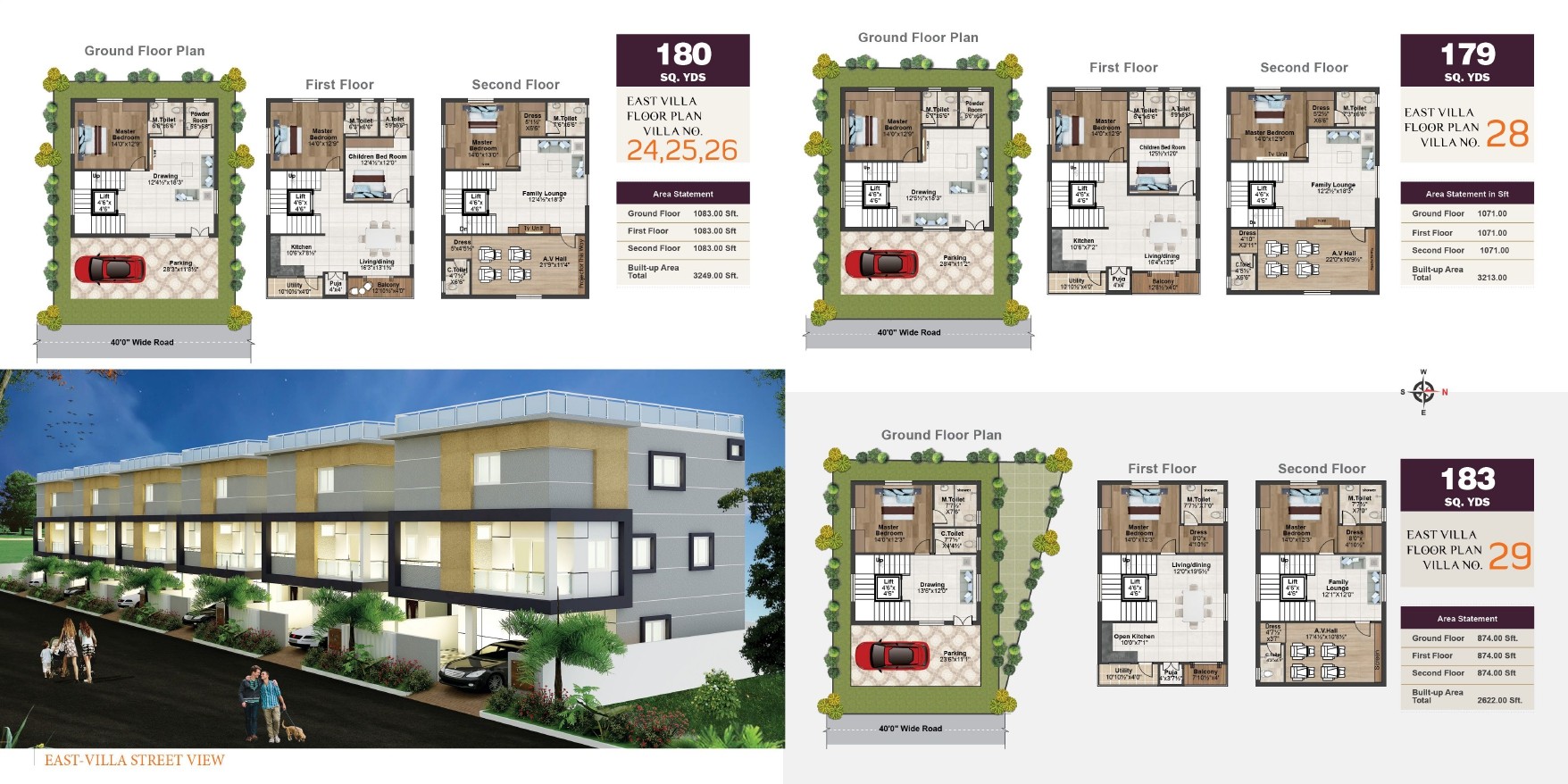 Independent villas with multiple floor configurations and spacious layouts. Plot sizes include 180 sq. yds (West-facing) and 153 sq. yds (East-facing). Built-up areas range up to approx. 3,159 sft (as per floor plans shown), with well-planned ground, first, and second-floor layouts.