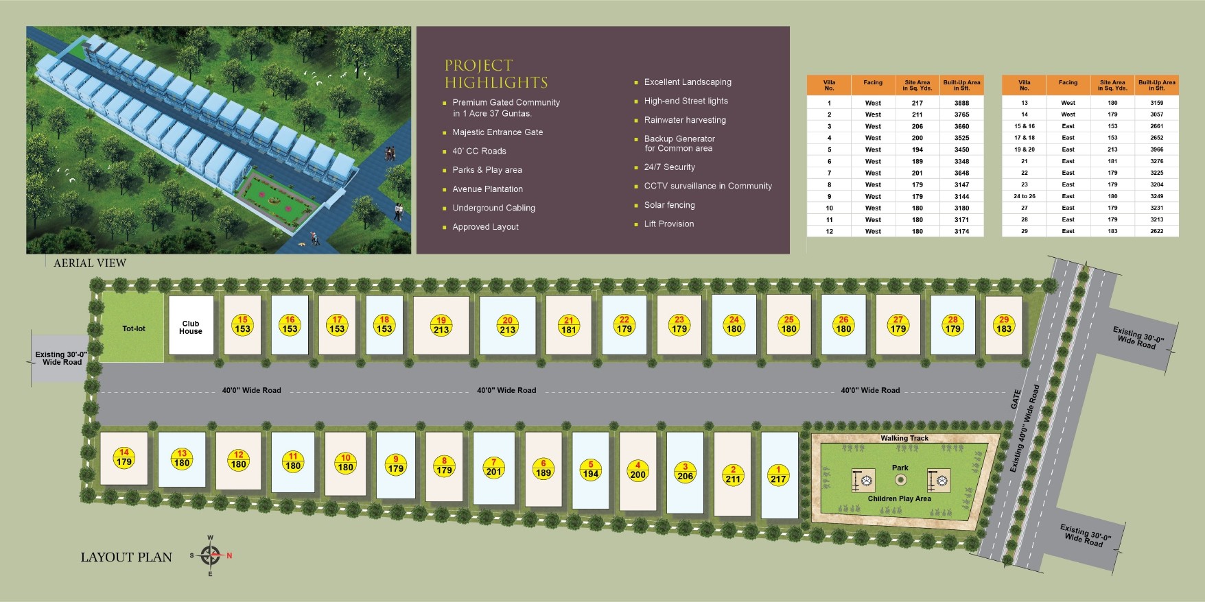 • Infrastructure: 40’ CC roads, underground cabling, avenue plantation, rainwater harvesting, backup generator for common areas, high-mast street lights, approved layout
