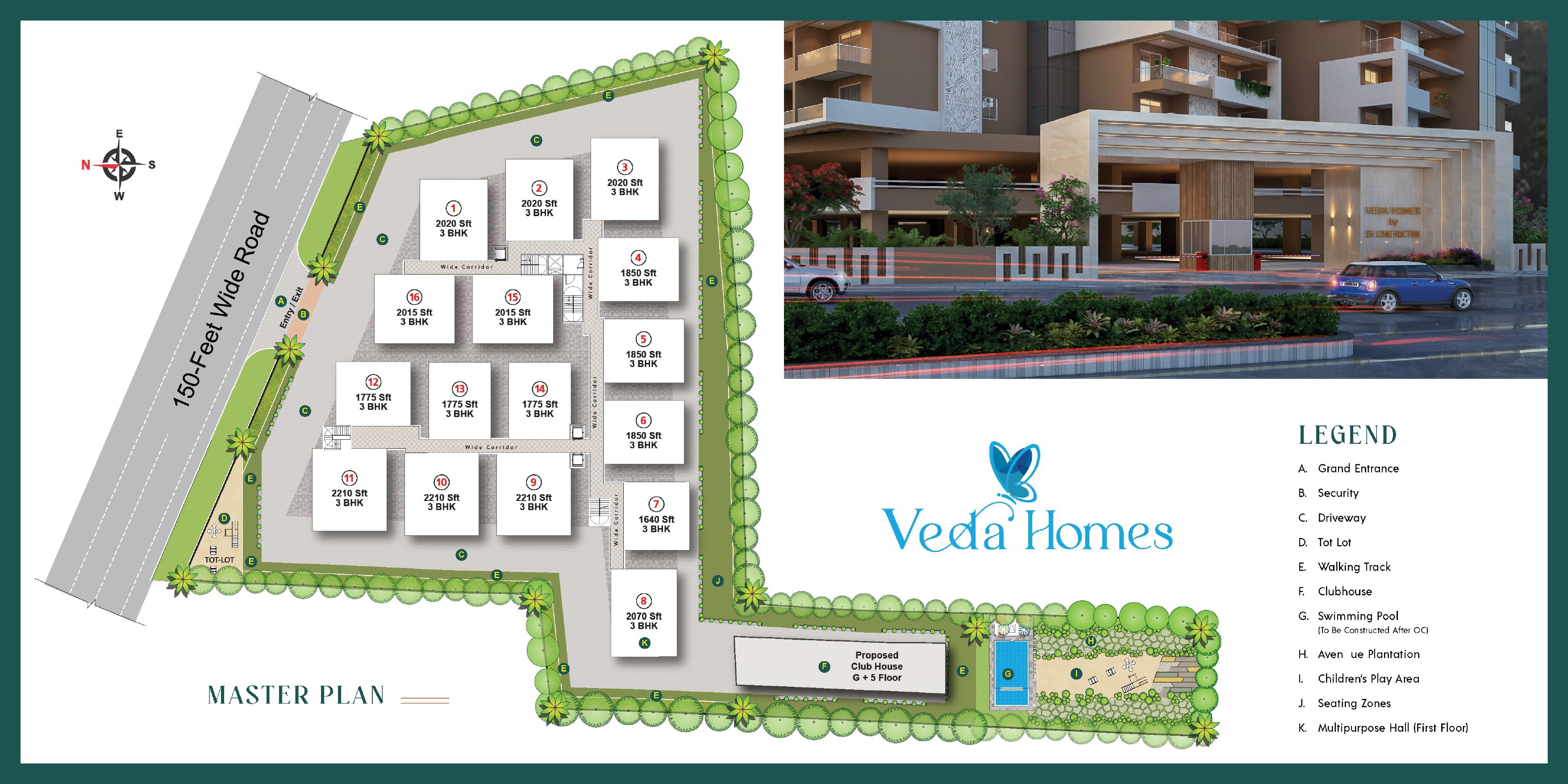 Veda Homes is a premium luxury apartment project offering spacious 3 BHK homes with modern community amenities, large clubhouse facilities, open spaces, and enhanced security features. The project focuses on comfortable family living with thoughtfully planned common areas and leisure spaces.